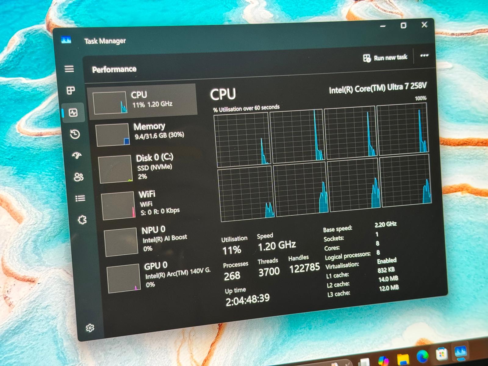 Aici începe distracția. Laptopul vine cu procesoare Intel Core Ultra, inclusiv variantele i9 288V, i7 258V și i5 228V. Sunt procesoare cu arhitectură hibridă și Intel AI Boost, deci sunt pregătite pentru aplicații moderne și taskuri avansate. Memoria LPDDR5X la 8533 MT pe secundă este extrem de rapidă, iar grafica integrată Intel ARC aduce suport pentru AV1, DirectX 12 și aplicații creative accelerate. Este un laptop făcut pentru multitasking serios, aplicații de editare sau sarcini AI.