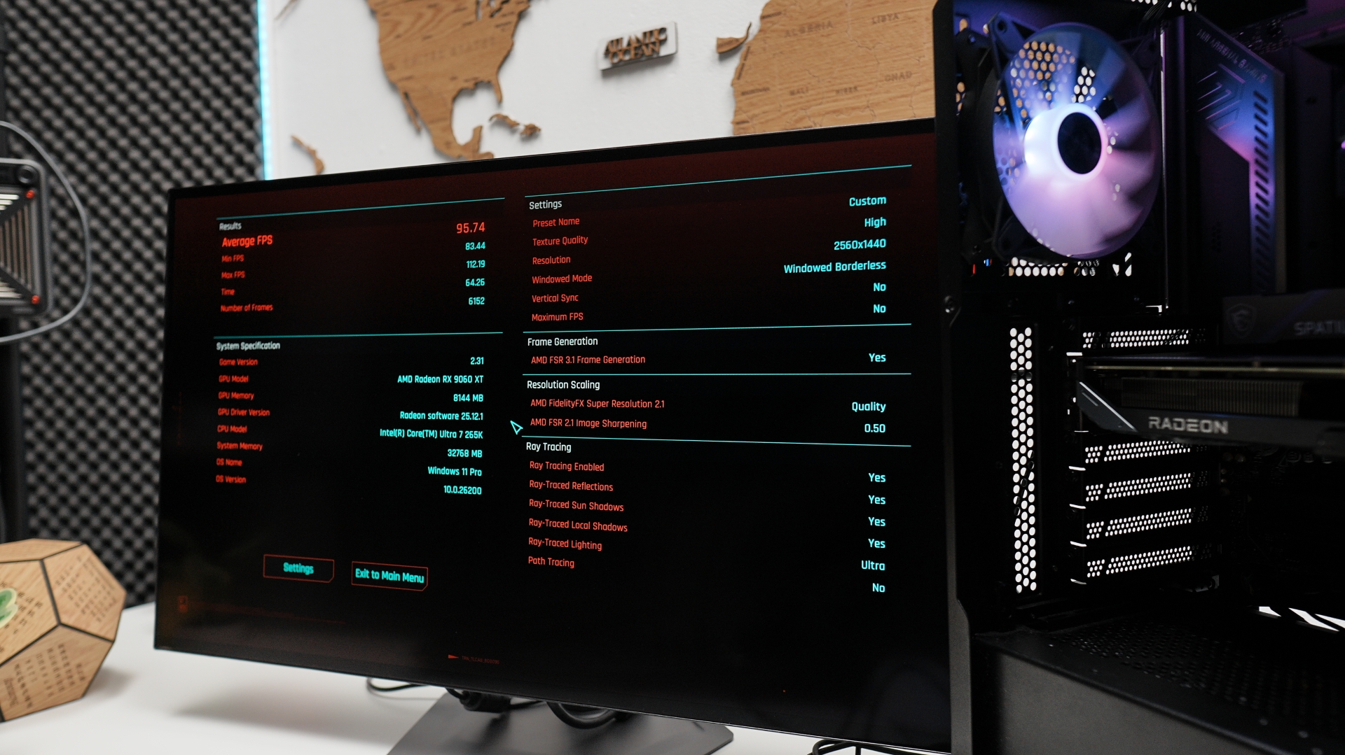 Cyberpunk 2077 este genul de joc care scoate la iveala orice slabiciune hardware. RX 9060 XT se descurca surprinzator de bine in rasterizare, mai ales cand este ajutata de tehnologiile AMD precum FSR si HYPR-RX.