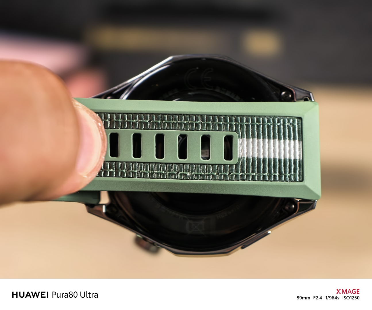 Elementul central al designului este cureaua Green Composite Woven Strap. Este o curea cu textură vizibilă, creată dintr-un material compozit țesut care transmite de la prima atingere ideea de rezistență și sportivitate. În același timp, e surprinzător de moale și plăcută pe piele, fără să provoace disconfort sau acumulare de transpirație după ore întregi de purtare.