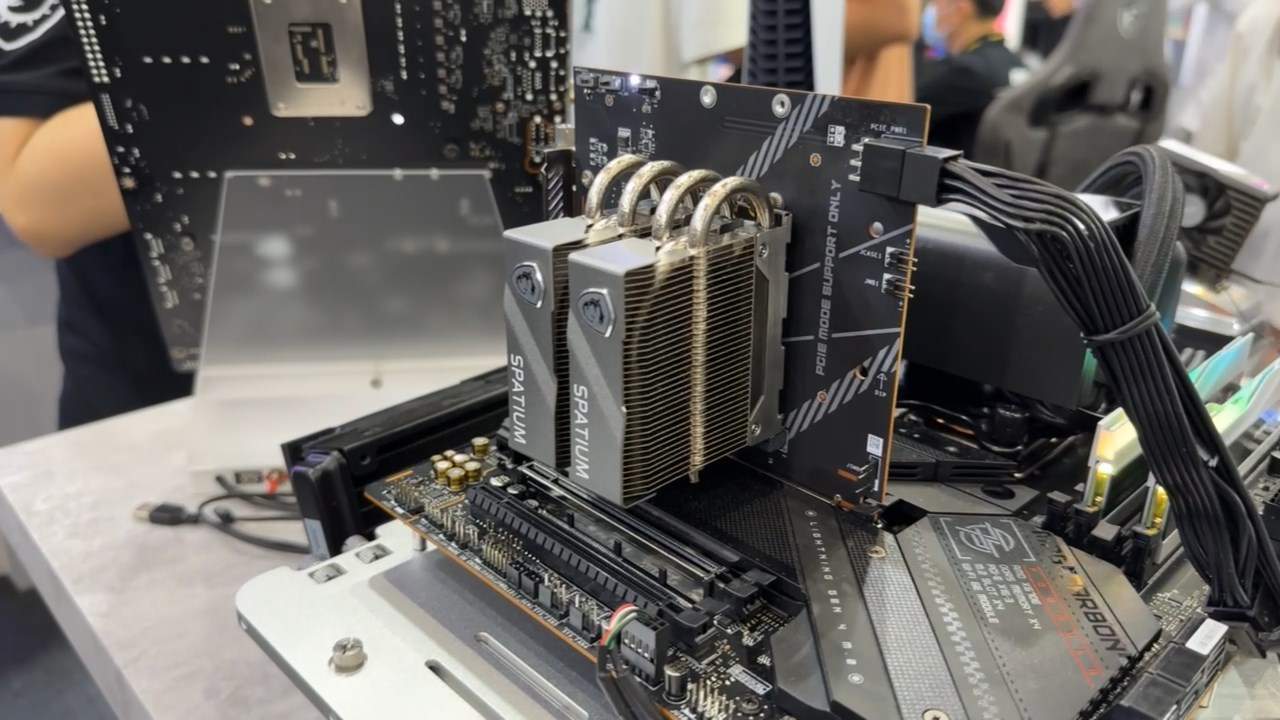 Pentru stocare, MSI a prezentat noua serie de top Spatium, care include un model numit M570 Pro, acest SSD utilizerază standardul PCIe Gen 5 și oferă viteze de până la 14GB/s. Acesta are un cooler dedicat active numit Frozr+, pentru a menține temperature de funcționare cât mai scăzută.
