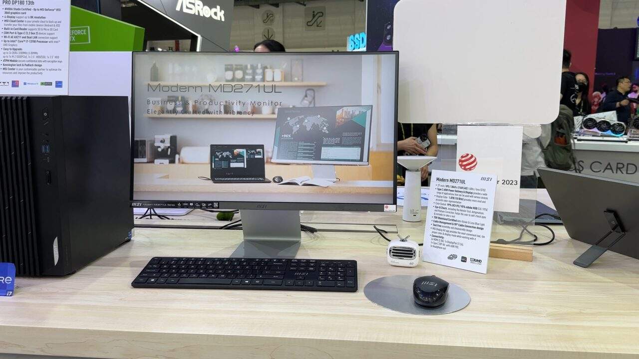 Pe partea de monitoare am vazut modelul Modern MD271UL, care a câștigat și premiul Red Dot Award 2023. Pe lângă un design premium, acesta are un ecran de 27 inch 4k, cu un panou exceptional, de tip IPS, care recunoaște 99% din spectrul DCIP3 și 139% SRGB.