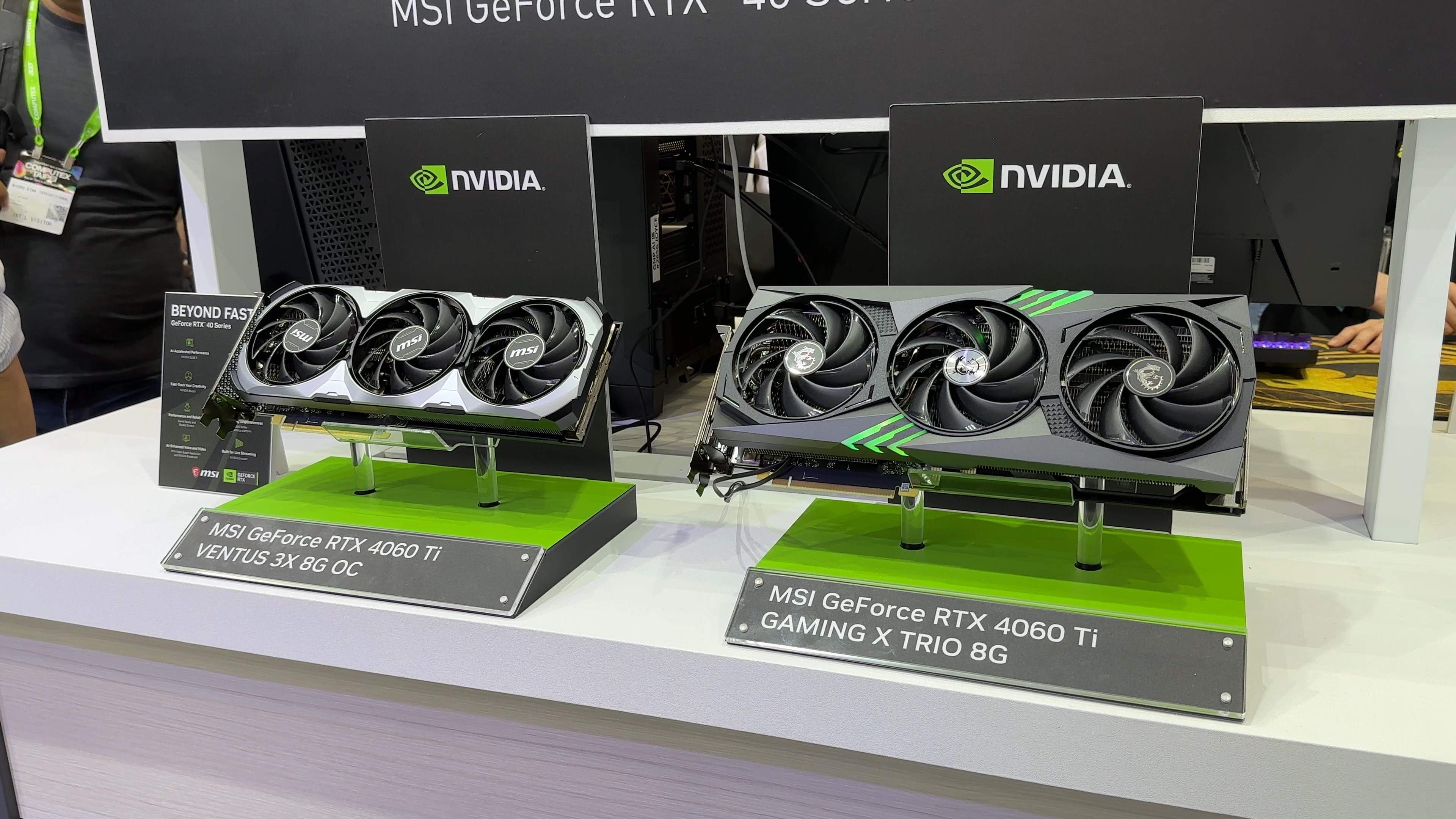 Pe partea de plăci video MSI a prezentat toată gama pentru RTX 4060 Ti, așadar au fost prezente variantele cu răcire Gaming Trio și Gaming, alături de Ventus 3X și varianta sa mai compactă Ventus 2X Black.