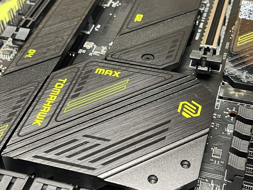 Cele patru sloturi M.2 sunt răcite de o placă din aluminiu. Aceasta face parte din tehnologia de răcire M.2 Shield Frozr de la MSI și asigură o funcționare stabilă pentru dispozitivele de stocare M.2.