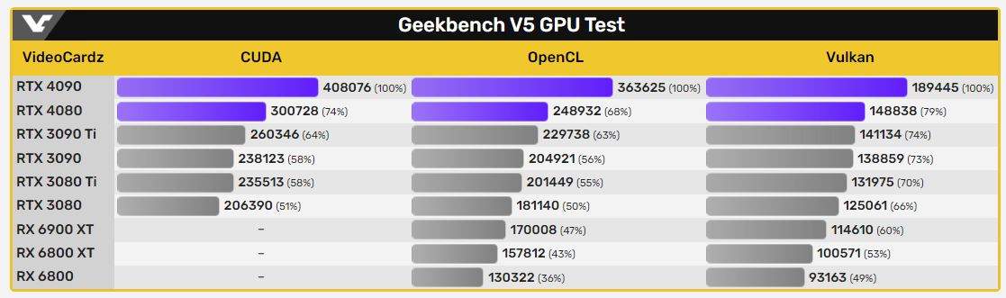 Conform clasamentului oficial, RTX 4080 este cu 45,7% mai rapid decât RTX 3080 în testul CUDA, cu 37,1% mai rapid în OpenCL și cu 29,9% mai rapid în Vulkan API. În comparație cu cel mai rapid GPU Ampere (RTX 3090 Ti), acesta este cu 5,4% până la 15,5% mai rapid.
