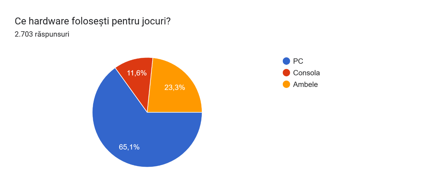 Conform informațiilor colectate, pasionaţii de jocuri preferă PC-ul (65,1%) și doar 11,6% se joacă exclusiv pe console. Ținând cont de faptul că unele jocuri sunt exclusiv pe PC sau pe consolă, 23,3% au răspuns că se joacă pe ambele platforme.