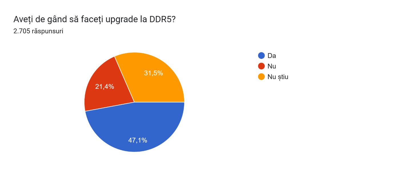 În ceea ce privește memoria RAM, standardul DDR4 este încă popular. Doar 16,5% dintre respondenți au răspuns că au trecut deja la DDR5, dar există un interes mare pentru noul standard, 47,1% dintre persoanele intervievate gândindu-se să treacă la DDR5. Memoria DDR5 a fost proiectată pentru a oferi rate de transfer de date superioare și o lățime de bandă extinsă în comparație cu DDR4. Acest lucru duce la îmbunătățirea performanțelor generale ale sistemului, în special în activitățile care se bazează foarte mult pe memorie, cum ar fi jocurile, crearea de conținut și analiza datelor.