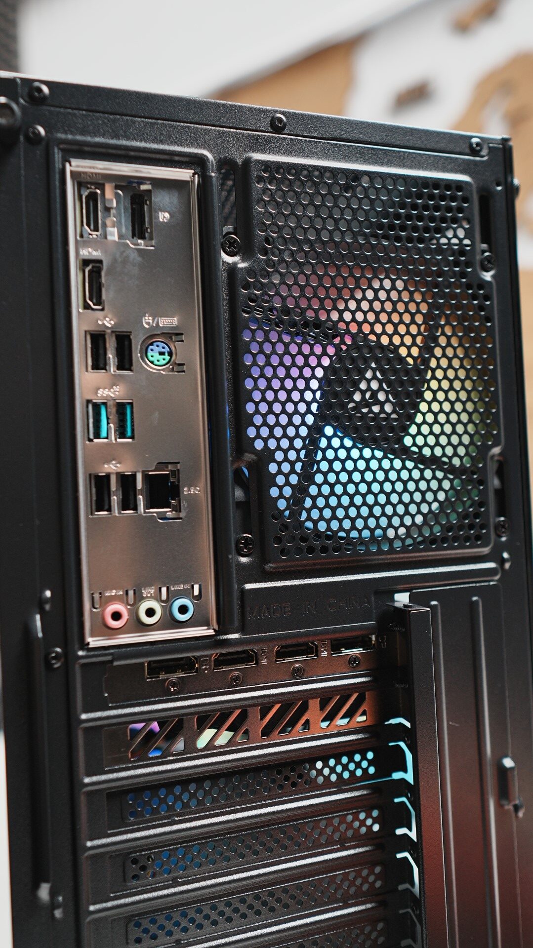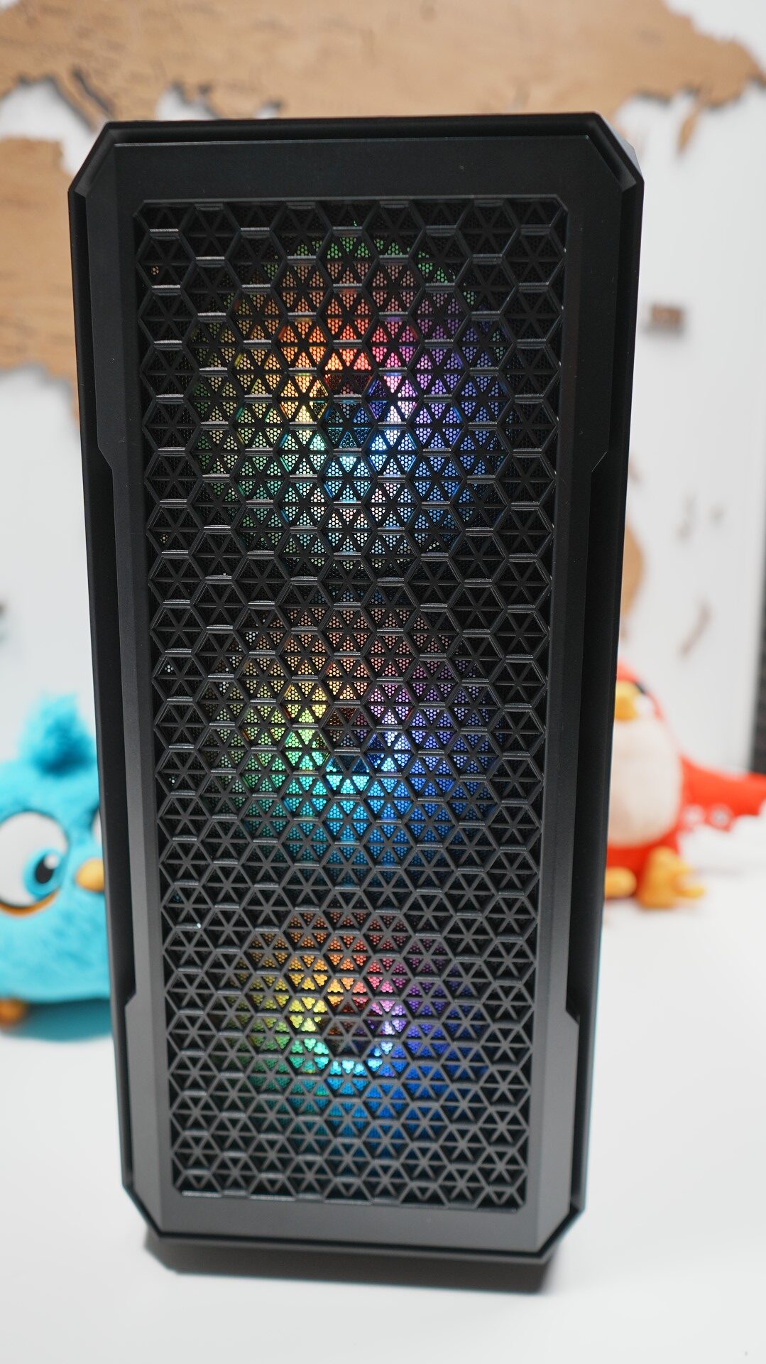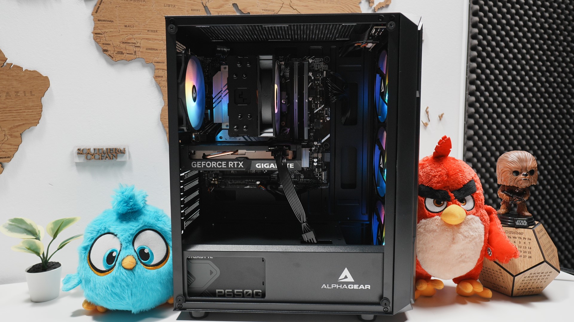 Sistemul vine într-o carcasă ALPHAGEAR Runesmith Black, construită cu atenție la detalii, cu un panou lateral din sticlă securizată (tempered glass) care scoate în evidență componentele și iluminarea FRGB. Cele 4 ventilatoare incluse (3 frontale și unul în spate) nu doar oferă un airflow excelent, dar și o prezență vizuală impresionantă. Dimensiunile sunt generoase (450 x 380 x 205 mm), permițând un cable management curat și un potențial de upgrade pe viitor.