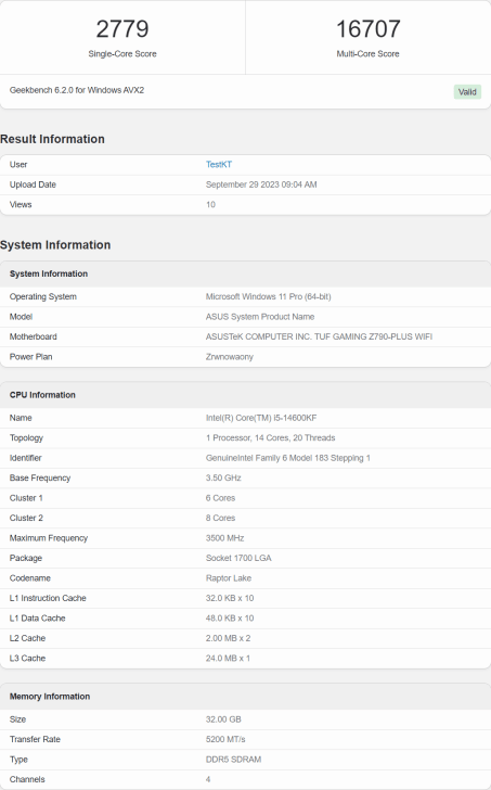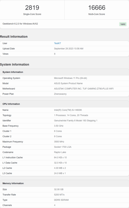 Acum, cele mai recente benchmark-uri au fost adăugate la baza de date Geekbench 6 și ne arată la ce ne putem aștepta de la performanța stock și overclockată a procesorului. Primul set de benchmark-uri rulează la stock folosind o placă de bază ASUS TUF Gaming Z790-PLUS WIFI, memorie DDR5-5200 (capacitate de 32 GB), iar rezultatul este un scor single-core de 2819 puncte și 16.707 puncte multi-core. Acest lucru marchează o creștere cu 6% a performanțelor single-core și cu 13% a celor multi-core față de i5-13600K.