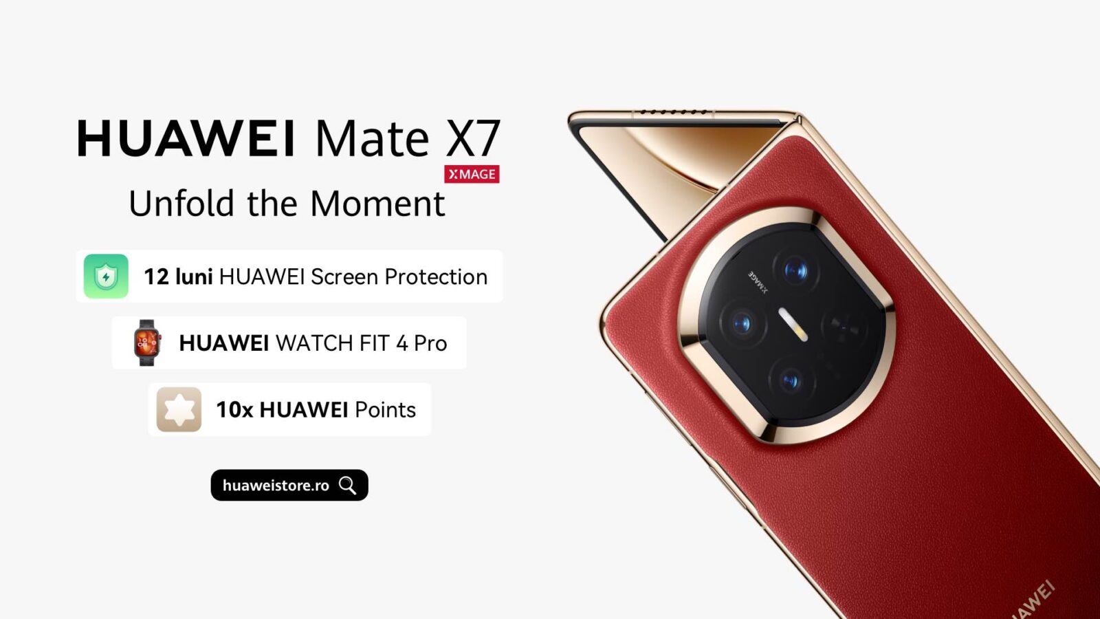 HUAWEI Mate X7 este disponibil în România începând din 27 ianuarie, în magazinul online HUAWEI Store și în rețeaua partenerilor oficiali, la prețul de 9999 lei. La achiziționarea oricăreia dintre cele două variante de culoare ale HUAWEI Mate X7 16GB+512GB, utilizatorii vor primi cadou smartwatch-ul FIT 4 Pro Black și vor beneficia timp de 12 luni de serviciul Screen Protection.