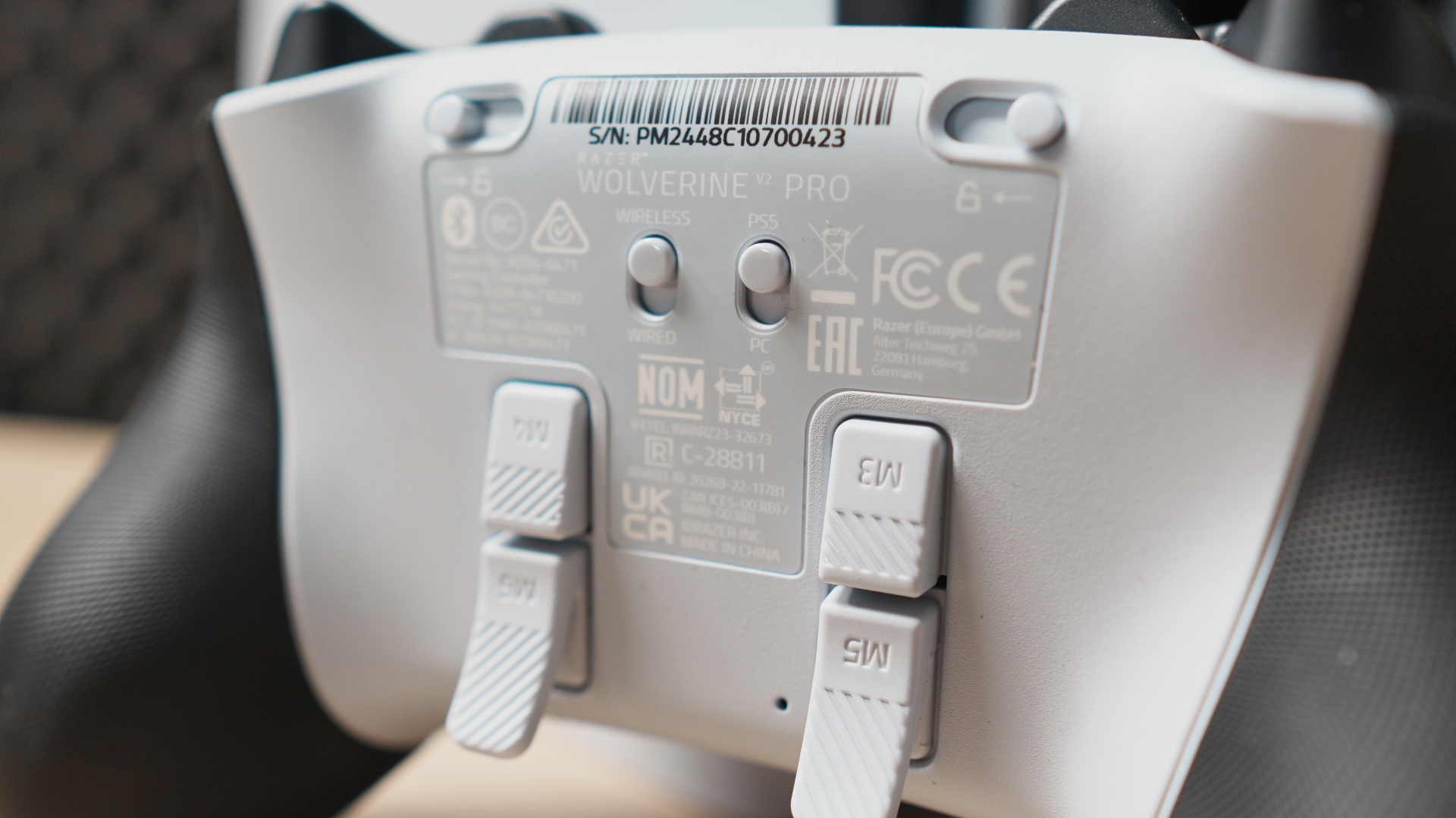 Wolverine V2 Pro funcționează atât cu PS5, cât și cu PC, și comutarea între platforme se face instant printr-un mic comutator aflat pe spatele controlerului. Poți alege între conexiune prin cablu USB-C (cu un cablu detașabil de 1,4 metri inclus în pachet) sau conexiune wireless prin tehnologia Razer HyperSpeed Wireless, care oferă latență extrem de redusă.