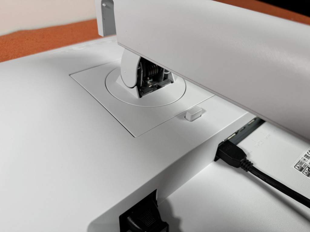 Ecranul de 31,5 inch este susținut de un picior metalic robust și o bază cauciucată, care previne alunecarea și face mutarea monitorului destul de dificilă. Gâtul metalic al monitorului include o adâncitură utilă pentru căști și permite ajustări variabile ale înălțimii, cu un interval de 110 mm. De asemenea, monitorul oferă reglaje pentru înclinare (5 grade în jos și 20 grade în sus) și rotire laterală, asigurând astfel o flexibilitate completă în poziționarea ecranului.