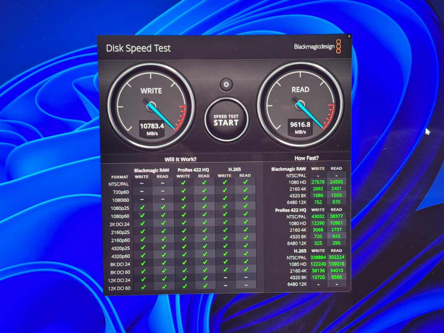 În Blackmagic Disk Speed Test, o aplicație utilizată în special în fluxuri video profesionale, viteza maximă de scriere a atins 10783 MB/s, iar cea de citire a ajuns la 9616 MB/s, confirmând faptul că SSD-ul poate susține cu ușurință editarea și redarea în timp real a fișierelor video la rezoluții foarte mari, inclusiv 8K.