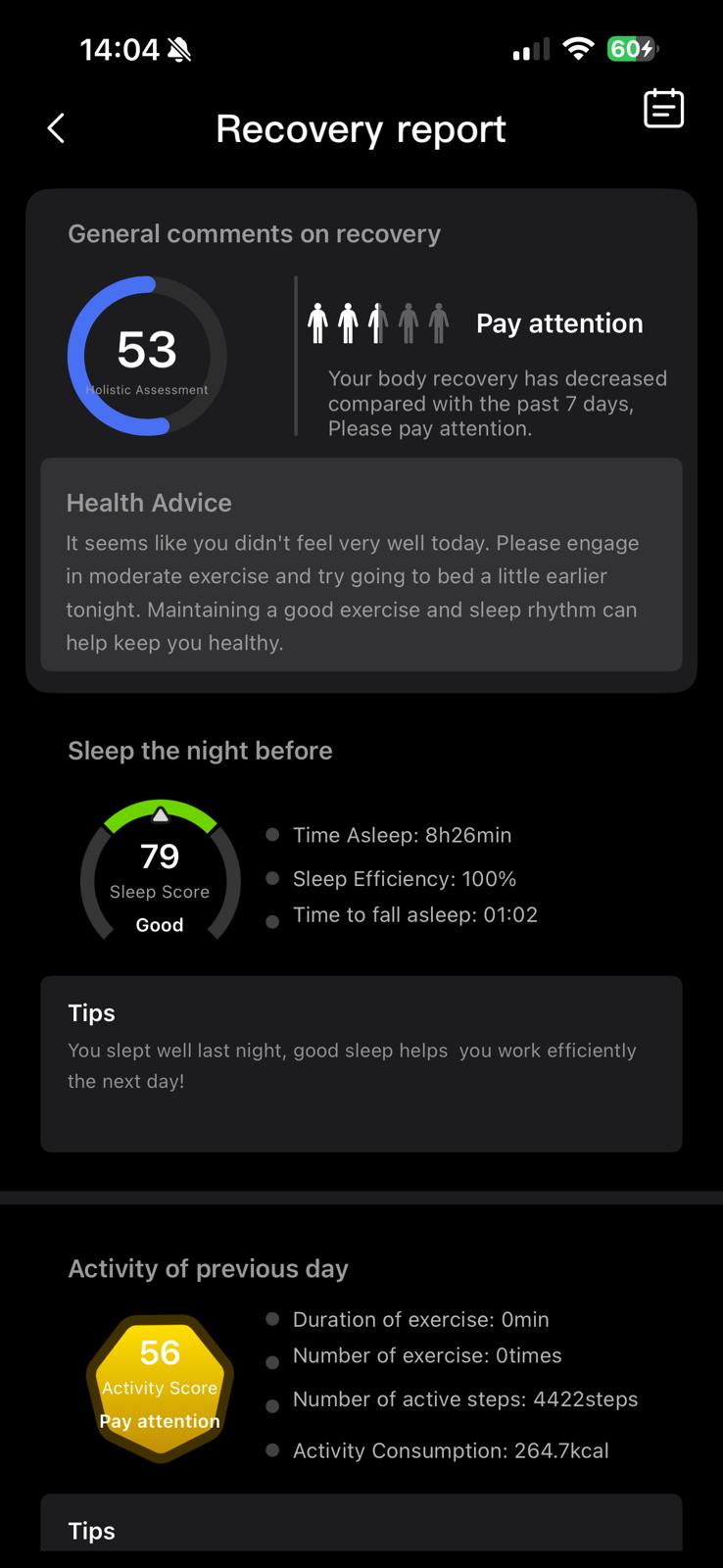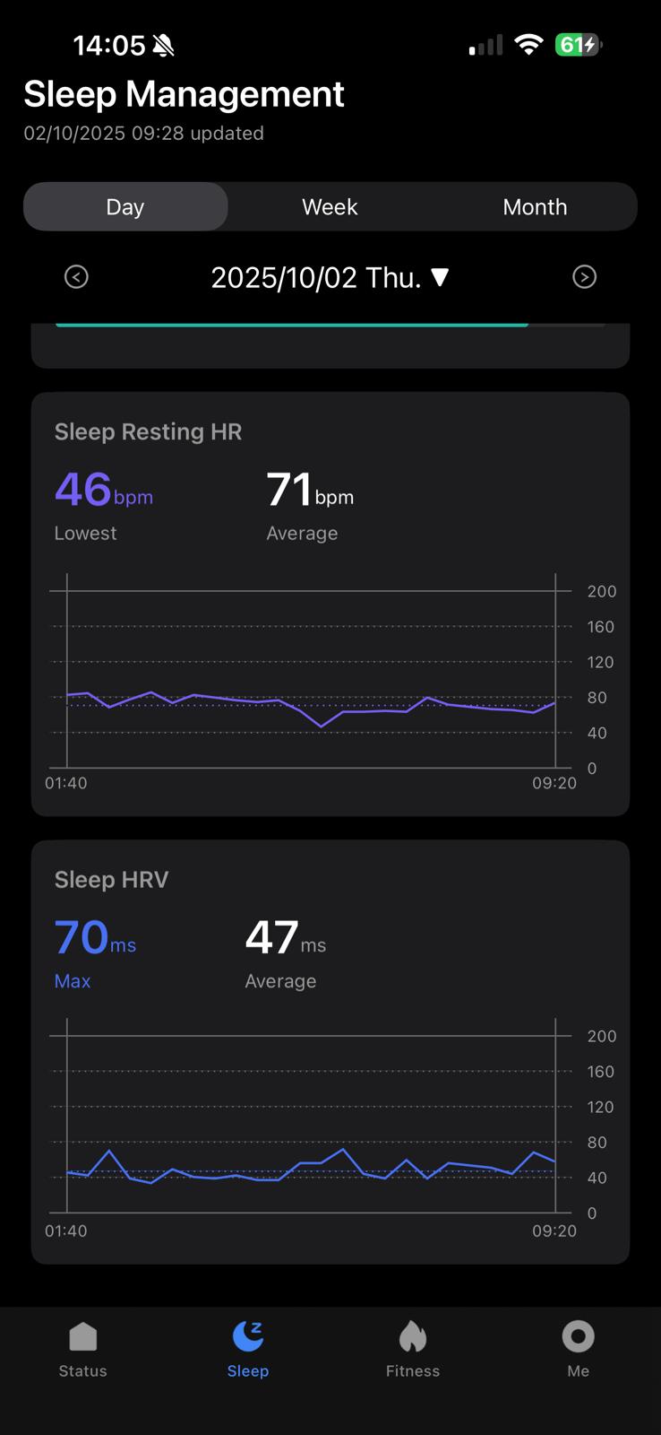 Monitorizarea somnului, de exemplu, a reușit să distingă corect fazele de somn profund, ușor și REM, oferind un raport detaliat dimineața. Pulsul este măsurat constant, iar valorile s-au potrivit cu cele obținute de pe un smartwatch consacrat, ceea ce e un mare plus. M-a impresionat și faptul că MR200 poate măsura temperatura corpului și variația ritmului cardiac (HRV), un indicator important pentru stres și recuperare.