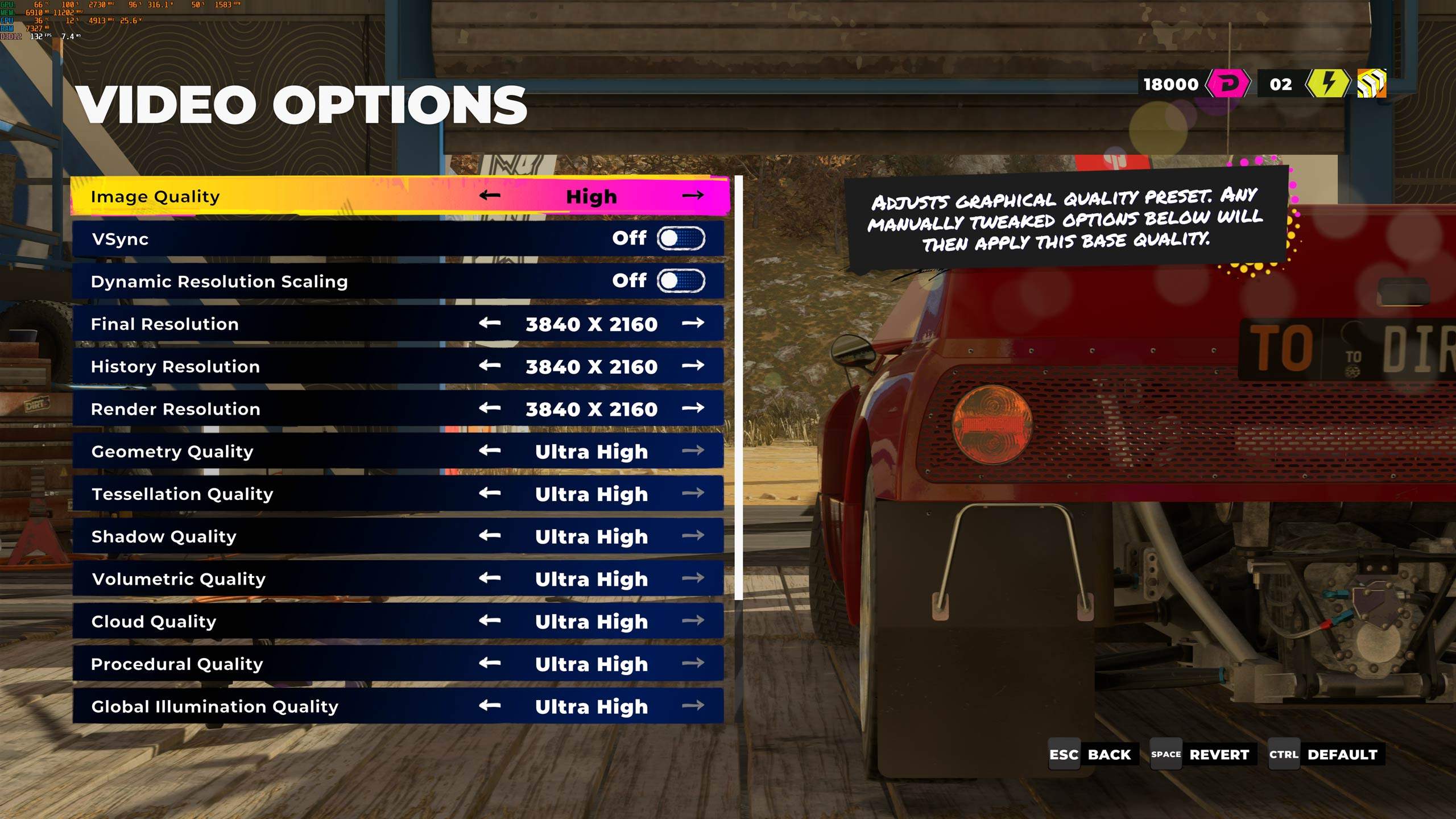 În Dirt 5 am setat totul la maxim și rezoluția pe 3840 x 2160, pentru toate cele trei opțiuni.