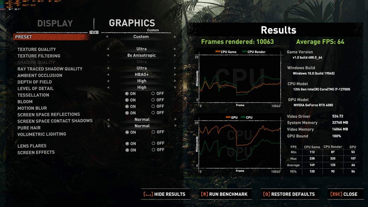 Shadow of the Tomb Raider l-am testat în două feluri. Odata cu DLSS pus pe OFF dar cu Ray Tracing ON, și odată cu DLSS ON și Ray Tracing ON. În primul test, cu DLSS oprit, am avut o medie de 64 FPS-uri, evident cu toate la maxim și rezoluție 4k.
