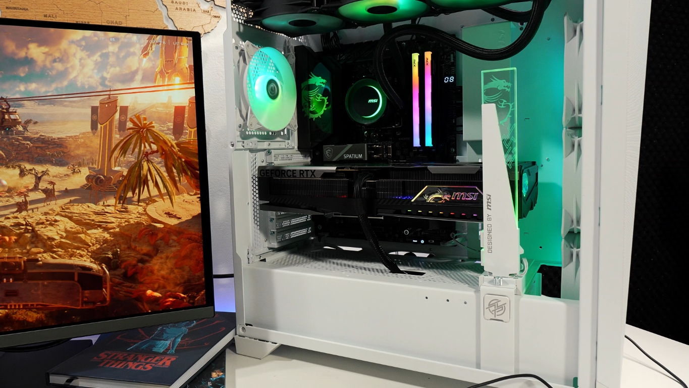 Pentru a analiza performanțele RTX 5070 Ti, placa a fost testată pe un sistem high-end, capabil să evidențieze întregul său potențial. Configurația utilizată include placa de bază MSI MAG X870E CARBON WIFI, alături de procesorul AMD Ryzen 7 9800X3D, un model optimizat pentru gaming datorită memoriei cache extinse. Sistemul a fost echipat cu 48GB de memorie RAM DDR5 XPG Lancer Blade la 6000MT/s, iar stocarea a fost asigurată de un SSD MSI SPATIUM M580 PCIe 5.0 NVMe M.2 FROZR, oferind viteze extrem de rapide pentru încărcarea jocurilor și transferul de date. Carcasa utilizată a fost MSI MPG GUNGNIR 300R WHITE AIRFLOW, optimizată pentru un flux de aer eficient și un design modern.