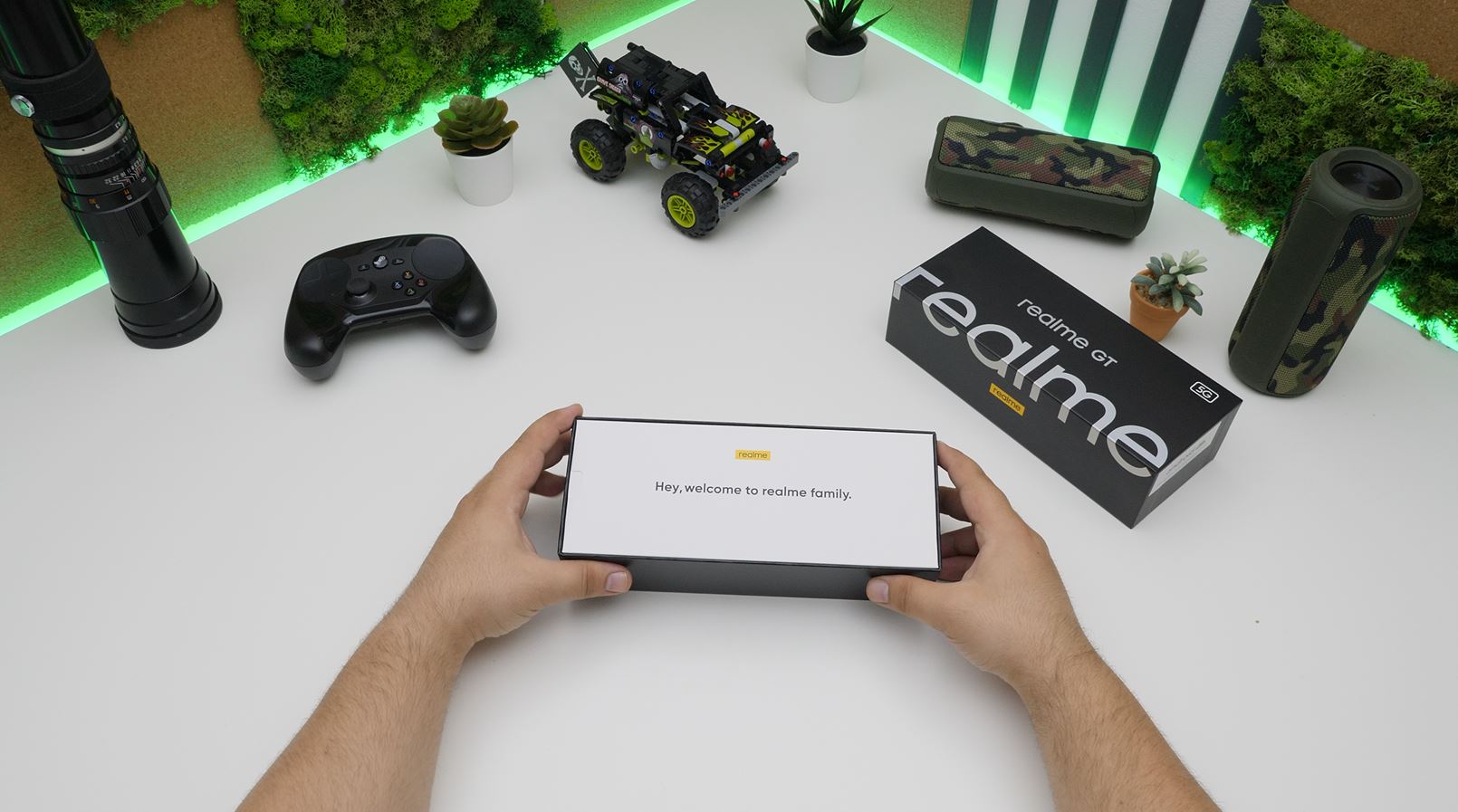 Deschizând cutia telefonului, vedem un mesaj de bun venit în familia realme. Alături avem telefonul, evident, un încărcător rapid de 65W și o husă transparentă. Ca fapt divers, aceștia au depăsit 70 de milioane de utilizatori. Incredibil pentru un brand care are doar 3 ani de la apariție, a evoluat extrem de mult, iar această creștere rapidă ar trebui să însemne că produsele realizate de ei chiar merită atenția voastră.