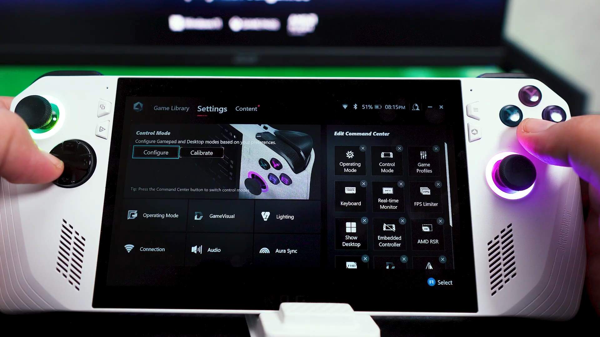 Dupa setarea Windows-ului, suntem întâmpinați de ASUS Armory Crate. Acesta este un fel de suprapunere extinsă care reprezintă principalul „hub” al consolei. Aici vom găsi toate jocurile instalate, precum și referințe directe la aplicațiile Steam și Xbox. Tot aici putem selecta modul de funcționare (silențios, performanță sau turbo), metoda de control a jocului, scenariul de setări, lansa tastatura de pe ecran, mergem pe desktop sau activa limitarea FPS-urilor la 15, 30, 45 sau 60. De asemenea, este posibil să eliminăm complet această limită, dar acest lucru se va aplica jocurilor mult mai vechi.
