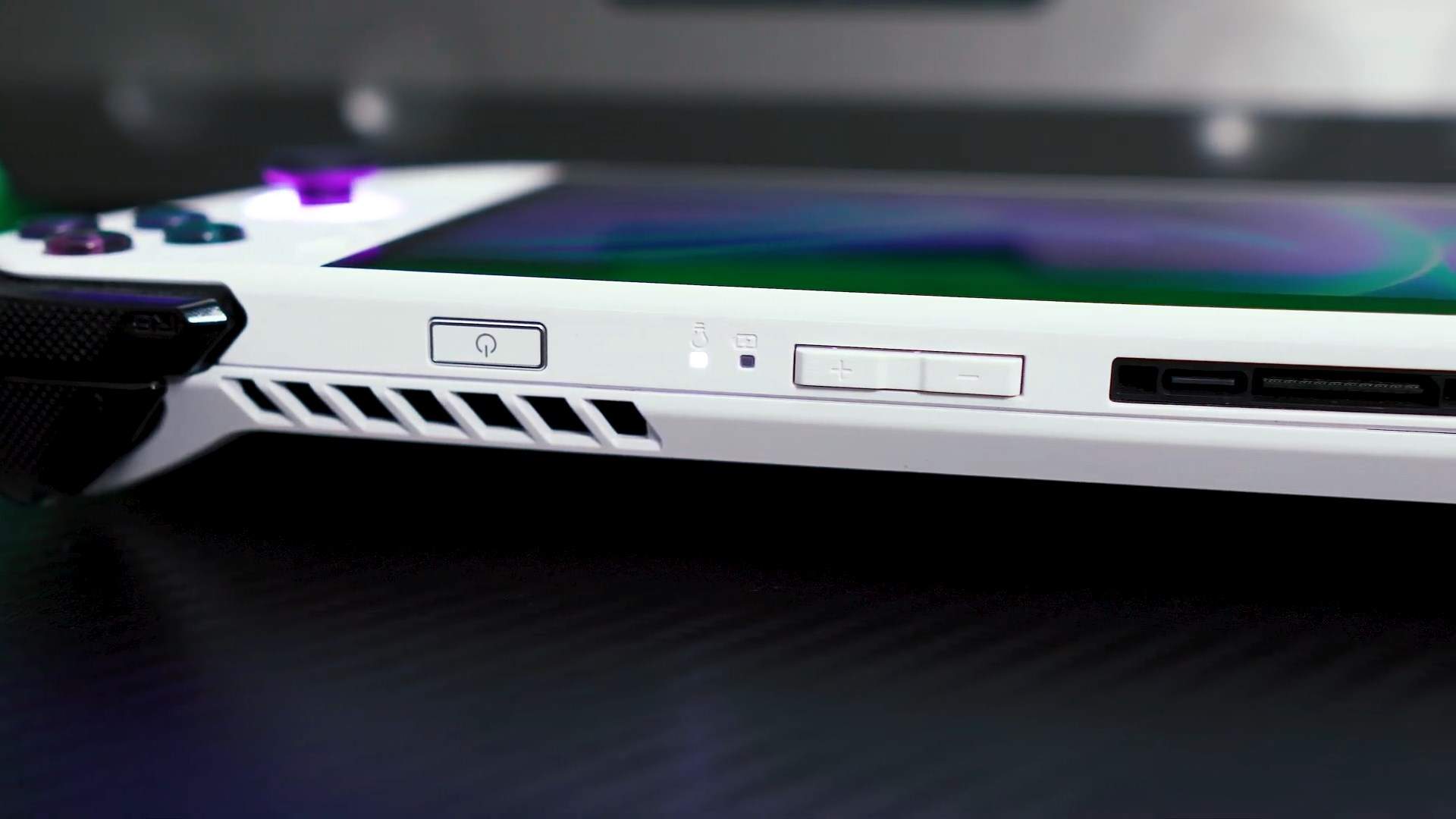 În partea superioară a dispozitivului, găsim un buton de power, cu un cititor de amprente ascuns în el, butoane de control al volumului, un conector USB-C pentru încărcare, LED-uri care indică funcționarea și starea bateriei, precum și un slot special pentru conectarea unor accesorii suplimentare, cum ar fi o placă grafică externă dedicată. De asemenea, nu lipsește nici spațiul pentru un card microSD, deoarece există „doar” 512 GB de stocare SSD încorporată, precum și o intrare mini-jack. Partea din spate a șasiului, pe lângă cele două manete suplimentare care pot fi configurate după bunul plac, prezintă și prize de aer atractive , precum și o bandă colorată, strălucitoare, care reflectă lumina și conferă un plus de farmec consolei. La fel ca și zonele luminoase din jurul joystick-urilor. Aceasta adaugă caracter și sugerează în mod clar că avem de-a face cu un echipament de gaming.