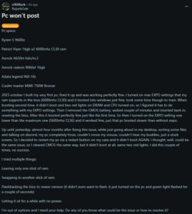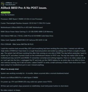 Unii utilizatori au încercat schimbarea memoriei RAM, resetarea BIOS-ului sau testarea cu alte componente, însă problema a persistat. În urma acestor verificări, concluzia a fost că procesorul Ryzen 5 9600X nu mai funcționa deloc.