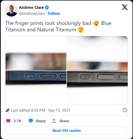 Dacă nu sunteți genul de persoană care să pună o husă, compania sugerează, de asemenea, utilizatorilor să își curețe iPhone 15 Pro cu o cârpă moale și ușor umedă. Apple vinde deja o cârpă de lustruire proprie care ar putea face o treabă excelentă, dar vă va costa încă 19 dolari. Schimbarea temporară a culorii modelelor iPhone 15 Pro este evidentă pe toate cele patru opțiuni de culoare. După cum puteți vedea mai jos, zona din jurul butoanelor și-a schimbat culoarea într-o nuanță mai închisă.