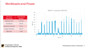 În teste precum Memory Test consumul a urcat până la aproximativ 108 W. În alte scenarii solicitante, cum ar fi conversia video sau benchmark-urile multi core, procesorul a înregistrat valori între 70 W și 85 W. Aceste cifre sunt remarcabile pentru un cip ARM și arată că Qualcomm urmărește segmentul laptopurilor de productivitate și creație digitală.