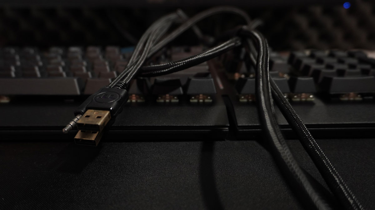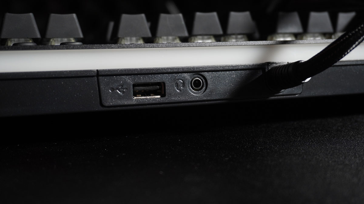 Banda albă de pe părțile laterale ale tastaturii este, de asemenea, futuristă: se întinde de-a lungul întregii tastaturi și este, de asemenea, iluminată în timpul funcționării. În vedere laterală, linia înclinată din zona frontală iese și mai mult în evidență. În partea din spate, cablul de conectare iese din centrul tastaturii. Imediat lângă acesta se află o conexiune USB și o conexiune jack de 3,5 mm. Thermaltake Level 20 RGB Gaming Keyboard are două porturi USB, care sunt marcate corespunzător. Unul este responsabil pentru operarea tastaturii, iar celălalt pentru conexiunea USB de pe spate. Există, de asemenea, o mufă jack audio de 3,5 mm, astfel încât căștile pot fi conectate la partea din spate a tastaturii.