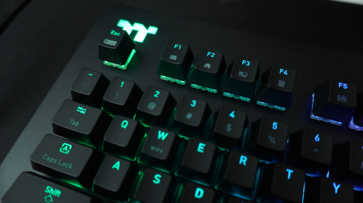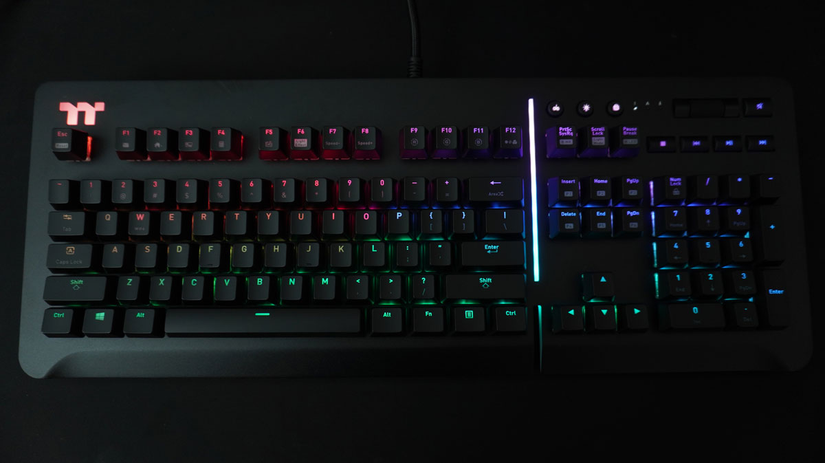 Thermaltake Level 20 RGB Gaming Keyboard știe cum să convingă cu iluminarea sa neobișnuită. Ceea ce este neobișnuit la ea este banda luminoasă din partea superioară, care separă tastatura principală de tastatura numerică și de tastele de funcție, precum și iluminarea pe părțile laterale ale tastaturii. Aici, utilizatorul are la dispoziție o mulțime de opțiuni pentru setări, iar literele sunt întotdeauna ușor de citit. Din fericire, Thermaltake nu a experimentat cu fontul pentru etichetarea tastelor și a optat pentru un font clar, dar modern.