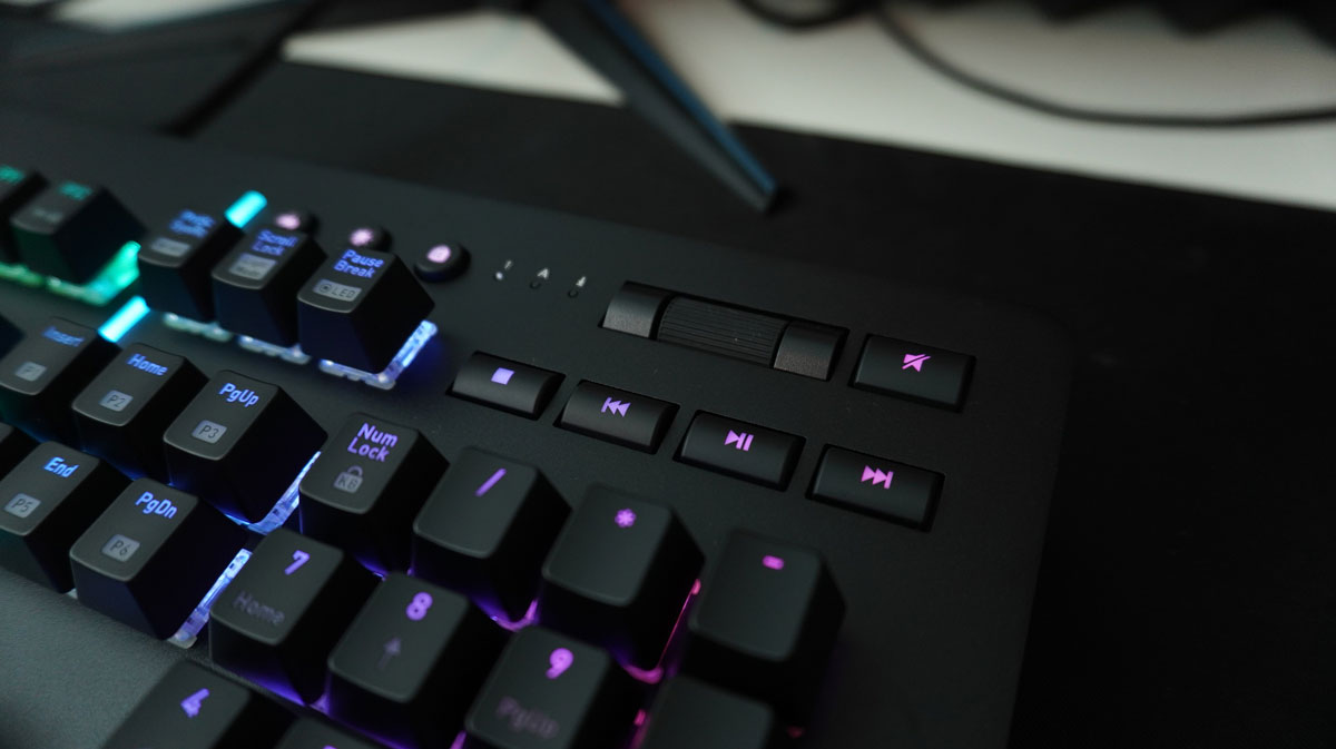 Deasupra tastaturii numerice găsim binevenitele taste dedicate pentru controlul multimedia. Tastele pentru redare/pausare, înainte, înapoi și stop sunt completate puțin mai sus de o rotiță pentru setarea volumului și o tastă pentru mute. Deasupra tastelor funcționale se află trei taste suplimentare care pot fi utilizate, de exemplu, pentru a dezactiva iluminarea de fundal sau tasta Windows. Între tastele funcționale și partea stângă a tastaturii se află o bandă luminoasă care este iluminată de LED-uri RGB în timpul funcționării. Acest lucru creează o separare optică, care arată foarte futurist.