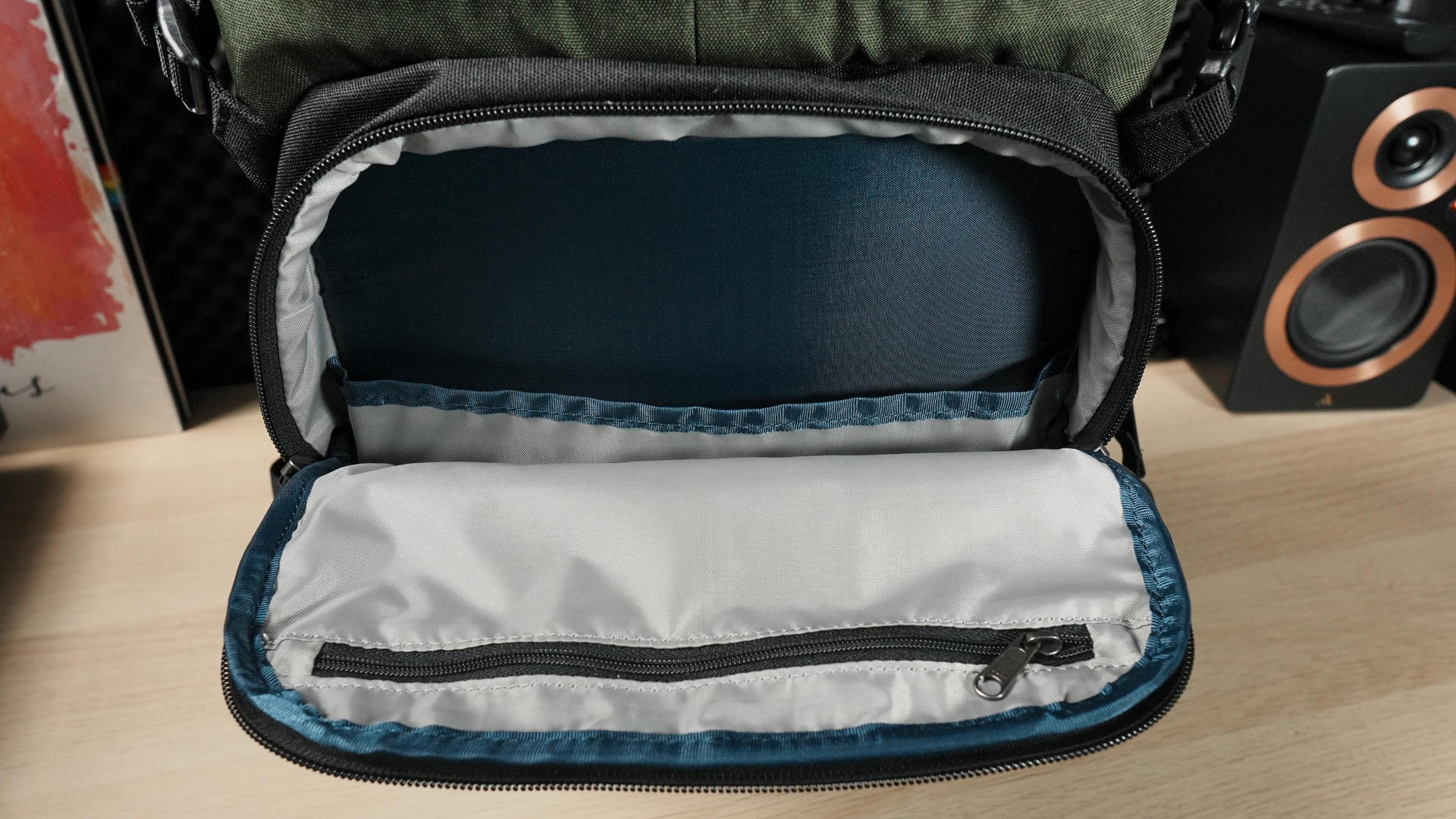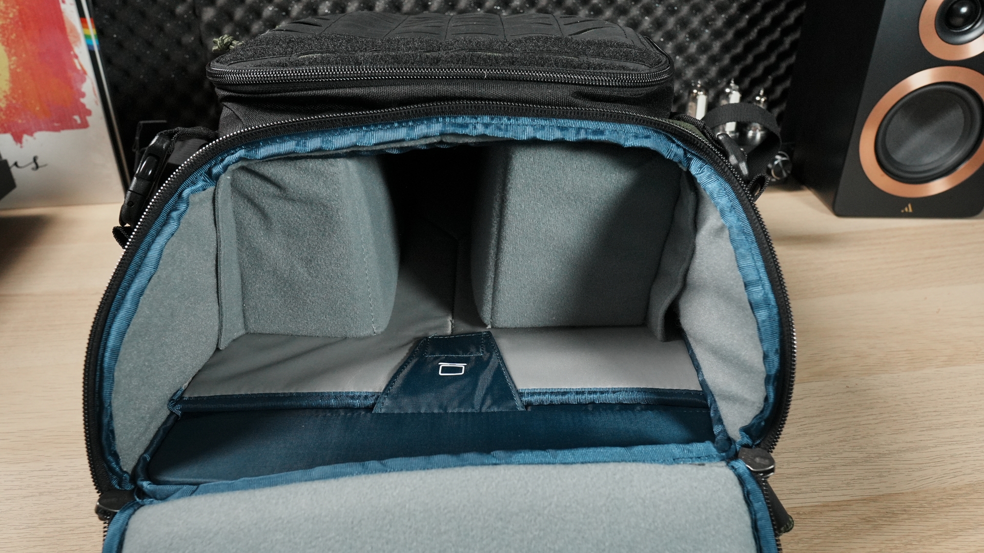 Pe hârtie, 20L poate suna modest. În realitate, spațiul este organizat excelent. Compartimentul principal este modular, cu separatoare bine căptușite și ușor de reconfigurat. Poți transporta fără probleme: