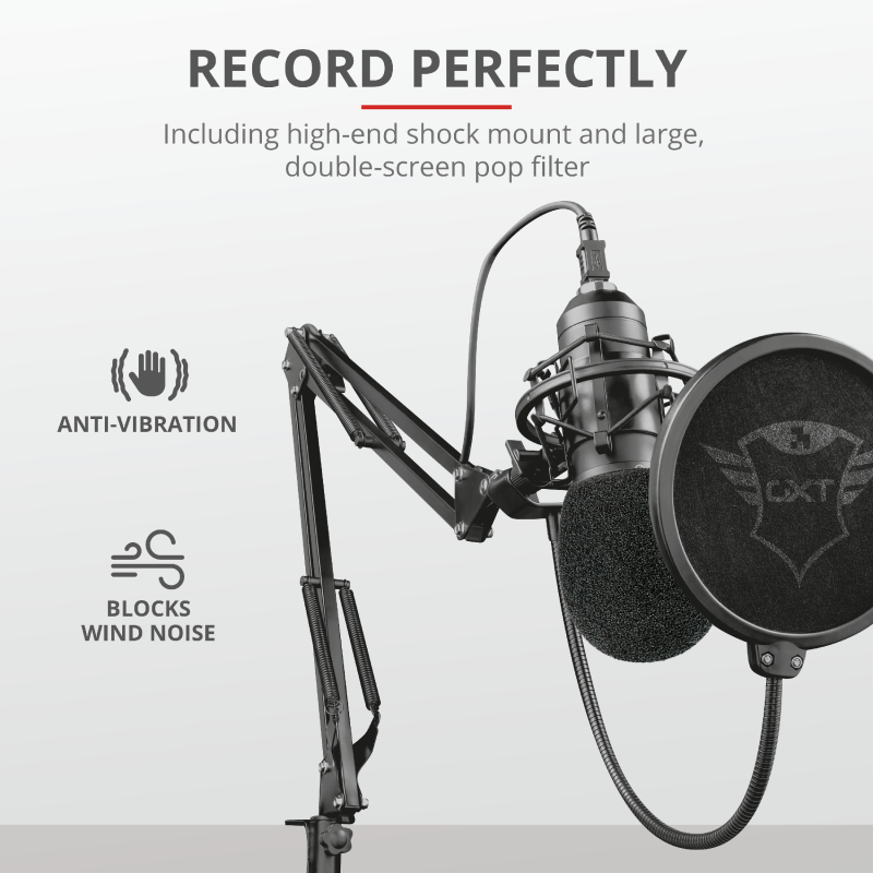 Cu microfonul în suportul de amortizare și pe braț, acesta captează mult mai puțin zgomotul produs de bătăi sau lovituri pe masa pe care este montat. Acesta este un lucru bun, mai ales dacă doriți să folosiți microfonul pentru streaming. În plus, Trust furnizează chiar și un burete care se pune direct peste microfon. Cu toate acestea, acest lucru nu este adesea necesar pentru un microfon care este utilizat în principal în interior.Trust furnizează, de asemenea, un trepied mic pentru birou. Acesta este stabil, deoarece are picioarele spațiate.